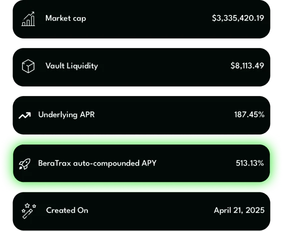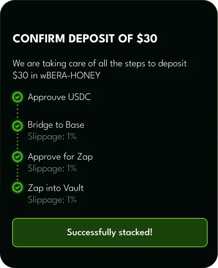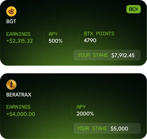 BGT and BGT derivative rewards are automatically reinvested into your vault, maximizing yield with zero effort.